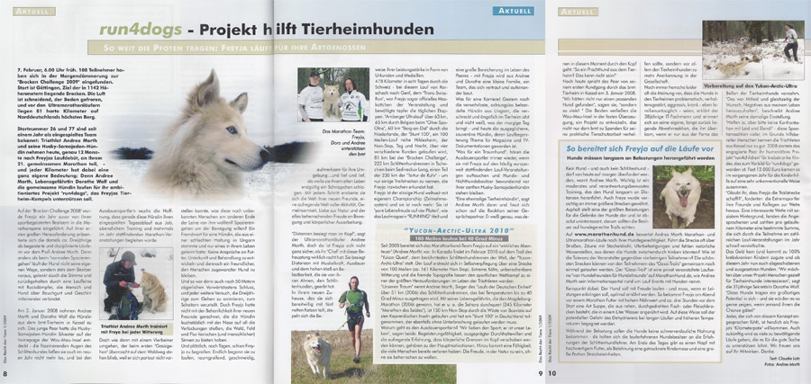 ______________________________________________________________________ 29.-30.08 2009 Das Belgian Dogtrekking Trail in St. Hubert war SUPER! _____________________________________________________________________ 23.03.2009 Artikel in DAS RECHT DER TIERE 1/09 (anklicken zum Vergrößern) _____________________________________________________________________ 21.03.2009 Testlauf für den 42 km H-Trail ... _____________________________________________________________________ 28.02.2009 Freyja und Andree beim "mushen" in Willingen _____________________________________________________________________ 14.02.2009 MARATHONHUNDE berichten im Laufmagazin "RUNNING" ____________________________________________________________________ 08.02.2009 Das NDR-Fernsehen berichtet über die Brocken-Challenge mit Freyja & Andree _____________________________________________________________________ 25.01.2009 Wir haben das SEDIVACKUV LONG222 KM Schlittenhunderennen in Destne (CZ) erfolgreich beendet. Bei der von uns als Spendenlauf durchgeführten Veranstaltung konnten wir 400 EUR zu Gunsten krebskranker Kinder und 222 EUR für notleidende Hunde erlaufen. Wir danken für die grosse Unterstützung! _____________________________________________________________________ 31.12.2008 Der Eulenkopflauf war unser Abschluß-Marathon 2008 Silvesterlauf mit Jens, Ronja, Steffen, Bonny, Sky, Doro, Andree & Freyja _____________________________________________________________________